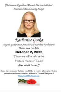 October 2nd Pearls and Politics Annual Fundraiser, Speaker Katharine Gorka American National Security Analyst. Historic Hanover Tavern.